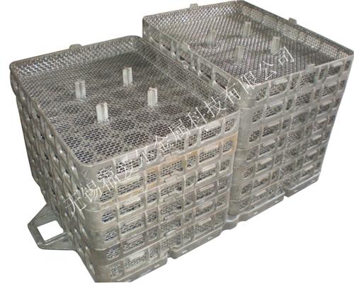 熱處理工裝之料筐主要是由2-4個單層熱處理用料筐筐架構(gòu)成的,而筐架是通過鑄造工藝制作而成的,并利用固定桿進(jìn)行固定形成一個整體,同時還保證了足夠的穩(wěn)定性。除了結(jié)構(gòu)比較合理之外,其所采用的材料也很特別,由于不銹鋼材料在這里使用壽命短且成本高,因此用普通的A3鋼代替,沒想到效果非常好。